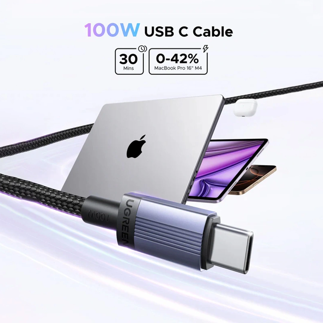 Experience high-speed power delivery and durable build quality with the UGREEN L528. This 1-meter USB‑C to USB‑C cable supports up to 100 W (20 V / 5 A) of USB Power Delivery, ensuring rapid charging for high-demand devices like laptops and tablets. Built for longevity, it features a nylon-braided exterior and laser-welded aluminum connectors, together enduring over 20,000 plug cycles and thousands of bends. The integrated E‑Marker chip intelligently manages power flow while safeguarding against over-voltage, over-current, and overheating. It also supports fast USB 2.0 data transfer at 480 Mbps, though it does not support video output. Perfect for charging—you can take an iPhone 15 from 0% to 60% in about 30 minutes or power up a MacBook Pro to 42% in the same time frame.